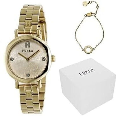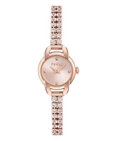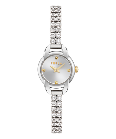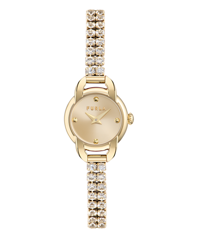 Regular price $399.00This mini gold-tone timepiece by Furla brings a luxurious touch to your wrist with its petite case and elegant design. The small 20mm case is paired with a delicate tennis bracelet, adorned with sparkling crystals. The gold dial adds to the minimalist design, while the crystals add a hint of glamour to its petite presence.